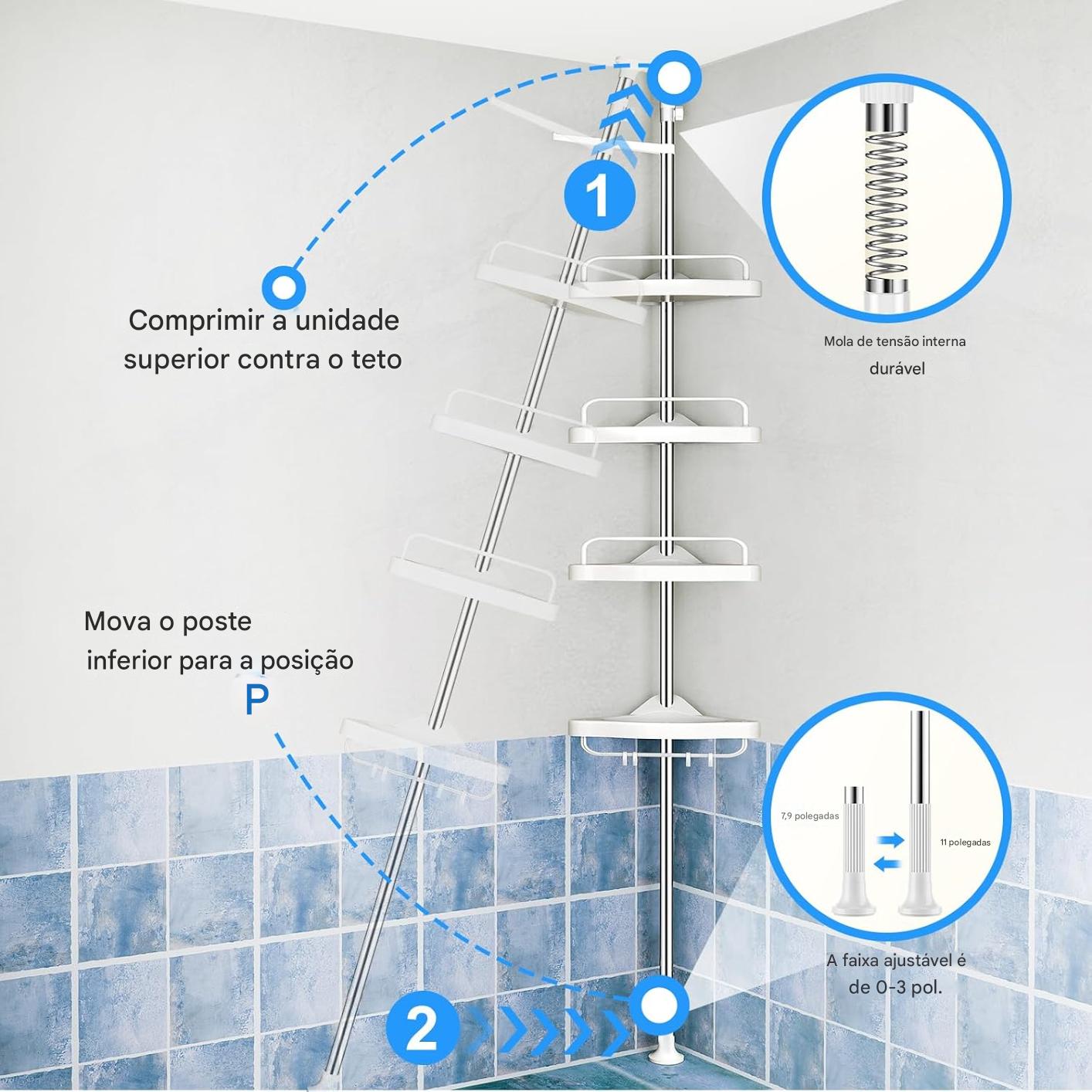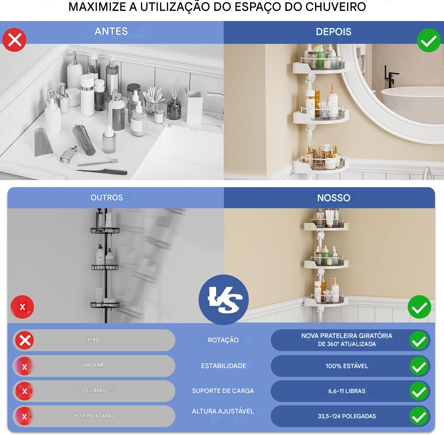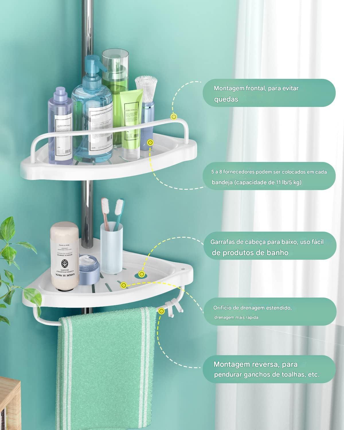 Imagine entrar no seu banho e encontrar tudo no sítio certo: shampoos, cremes, lâminas e acessórios perfeitamente organizados, ao alcance da mão. O Multi Corner Shelf é mais do que um simples suporte — é uma solução prática e sofisticada que aproveita cada centímetro do seu espaço, sem necessidade de furar paredes ou gastar em remodelações. Feito para quem valoriza ordem e funcionalidade, este suporte adapta-se à altura desejada e suporta o peso dos seus produtos com segurança. Além de otimizar o espaço, contribui para um ambiente mais limpo e agradável, tornando o momento do banho mais cómodo e relaxante.